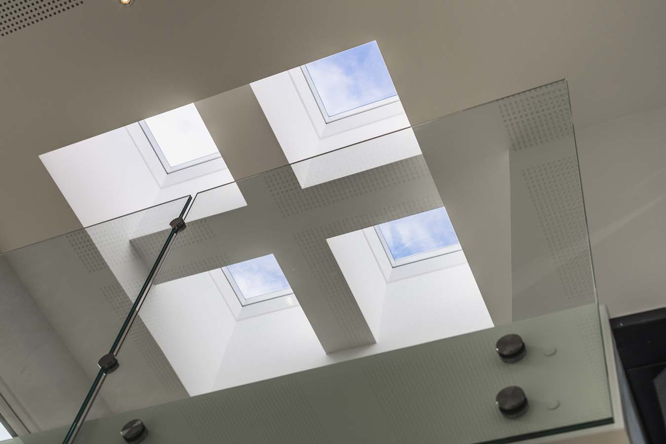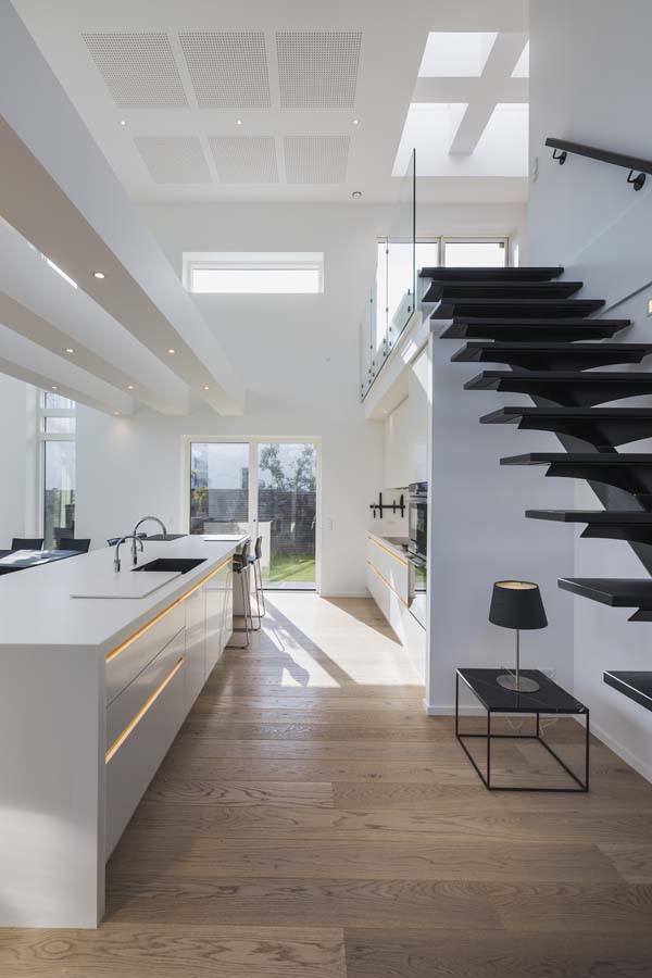 En elegant ståltrappe med centervange forbinder de to etager og bidrager til et let og svævende udtryk, der passer perfekt ind i villaens minimalistiske stil. På førstesalen er et åbent opholdsrum placeret under fire dobbelte ovenlyspartier, der giver et unikt lysindfald og skaber en lys og luftig atmosfære ned gennem boligen.
