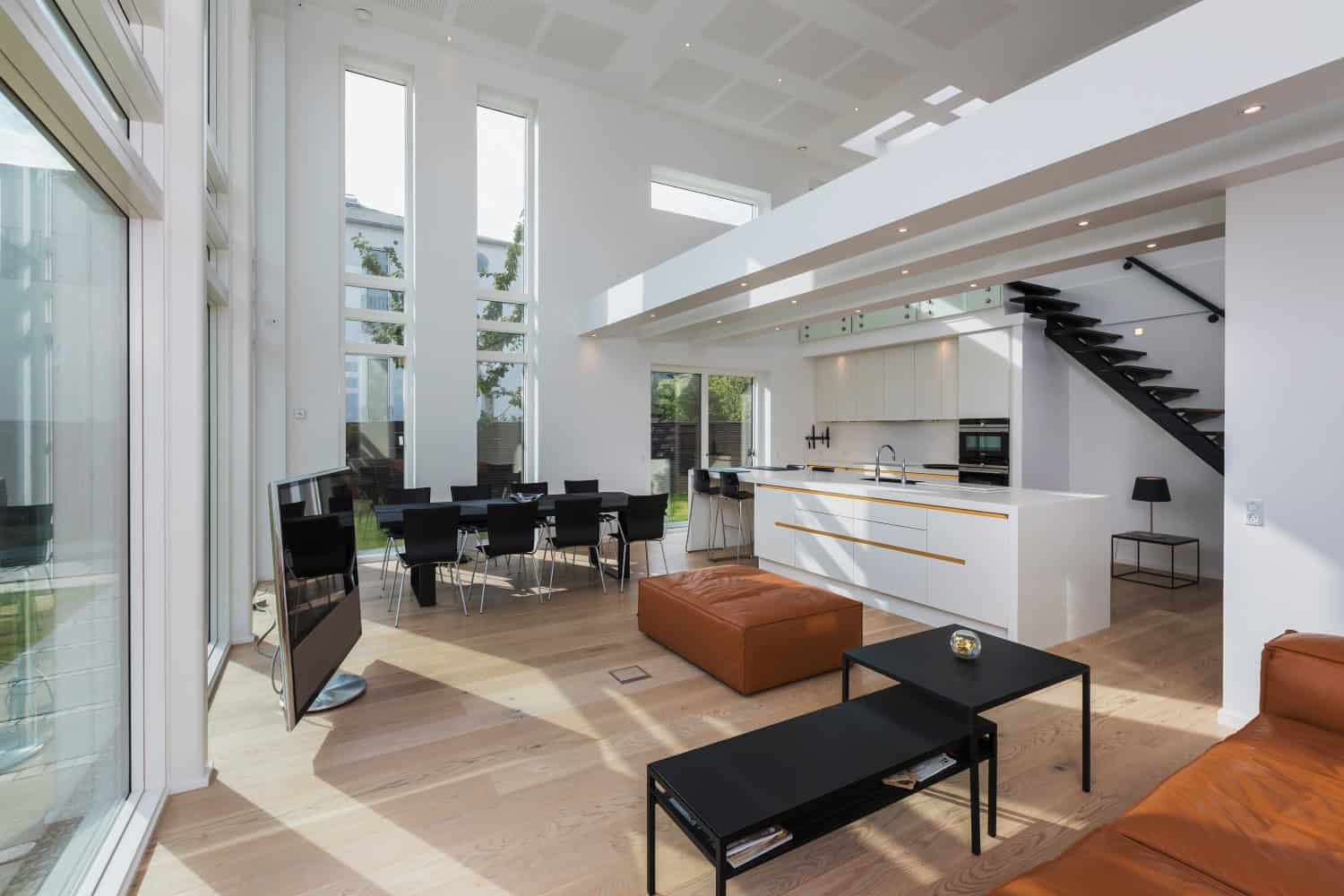 Indvendigt fortsætter villaens moderne udtryk med åbne rum. Det mest markante træk er det store køkken/alrum og stue, der er udformet som ét sammenhængende rum med dobbelt rumhøjde. Her skaber det imponerende glasparti i fuld bredde og højde en nærmest svævende oplevelse af rummets størrelse og åbner op for en betagende udsigt.