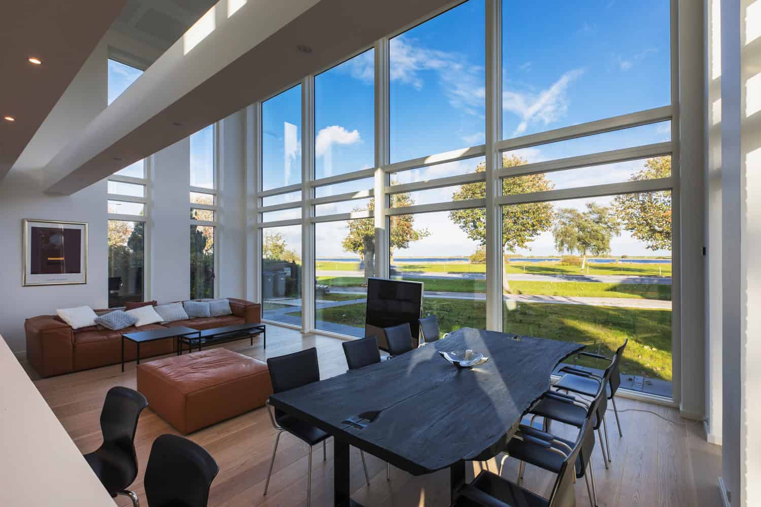 Der var potentiale for en uhindret udsigt over havet, og derfor dominerer store, dobbelthøje glaspartier i facaden på begge etager, hvor der er skabt et fantastisk lysindfald.