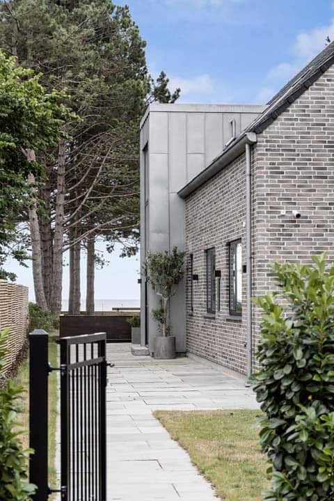 Facaden er opført i blankt murværk i grå nuancer, hvilket giver huset et stilrent, diskret og tidløst udtryk. Kombinationen af zink og murværk samt de sorte glaserede flade tagsten fra Creaton Domimo understøtter den minimalistiske stil. En zinkbeklædt frontspids på siden af huset bryder de skrå tagflader, og de store, dobbelthøje glaspartier forstærker den arkitektoniske dynamik og sikrer, at lyset spiller smukt ind gennem facaden og binder ude og inde sammen.