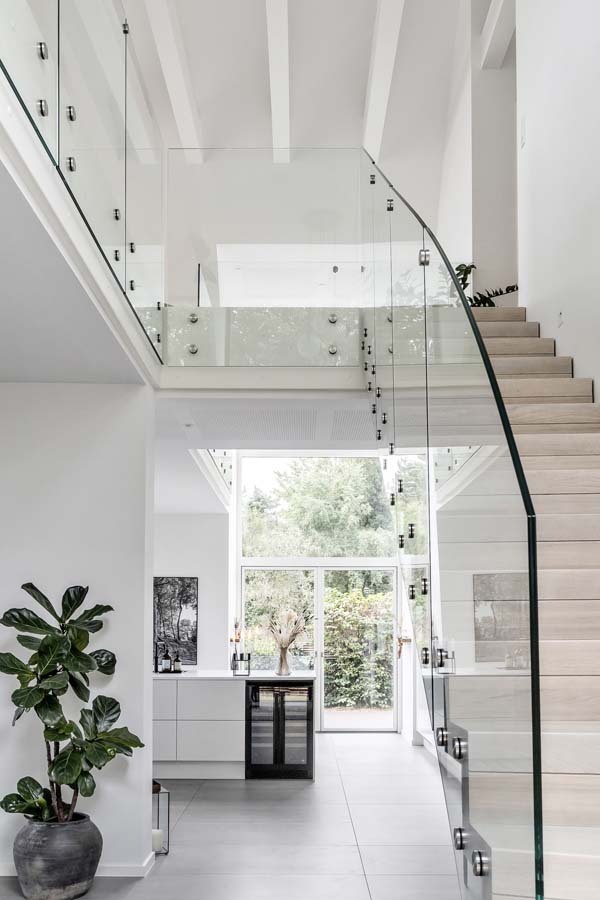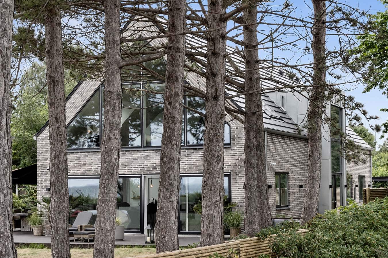 Denne villa i moderne arkitektur i 1½ plan på 302 m² ligger i første række til vandet. Derfor var førsteprioritet for designet at maksimere udsigten gennem nøje placerede glaspartier uden at gå på kompromis med en gennemtænkt og funktionel planløsning. Det udvendige udtryk skulle være en diskret forlængelse af de smukke, naturskønne omgivelser, og derfor er arkitekturen stram, og farvevalget afdæmpet.